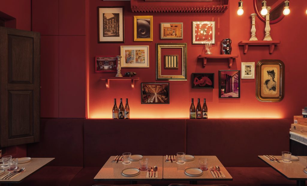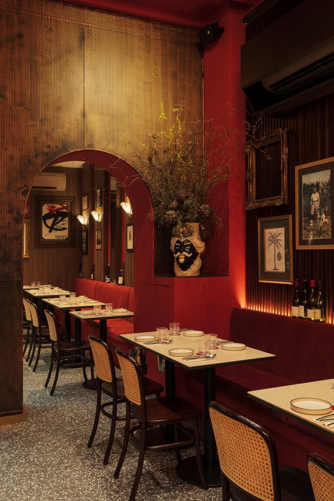 naui studio has created warmly-lit interiors for Bar Cicheti in Singapore with striking red decor evocative of the Venetian Bacari-inspired from the 1960s.